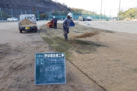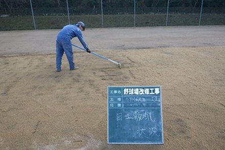 土木部門 2021.02.04公開 野球場改修工事 完成 工事概要 発注者 西尾市 工事名 野球場改修工事 工事場所 西尾市善明町 工事期間 令和2年9月〜令和3年2月 工事内容 内野舗装工、外野舗装工、湧水対策暗渠工 野球場の水はけを良くし、内野の土の入替え、外野の芝の張替え等を行う工事です。 着手前 整地・転圧状況① 整地・転圧状況② 芝転圧状況 目土散布 目土敷均し 完成 完成 完成
