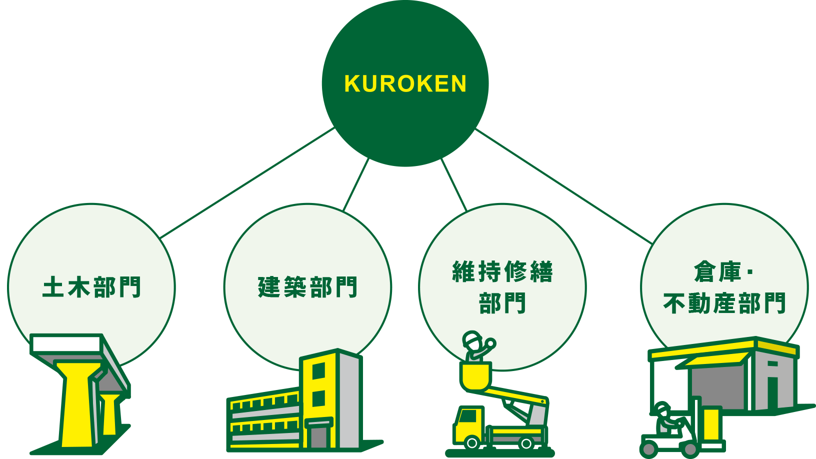 主な事業は土木部、建築部、維持修繕部、倉庫・不動産部の4つ